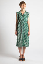 Detta är Mona! En grön klänning med blommor och knappar fram. Rak modell med veck vid axeln. Fin att användas både med och utan knytskärp. Klänningen är sydd i Estland.