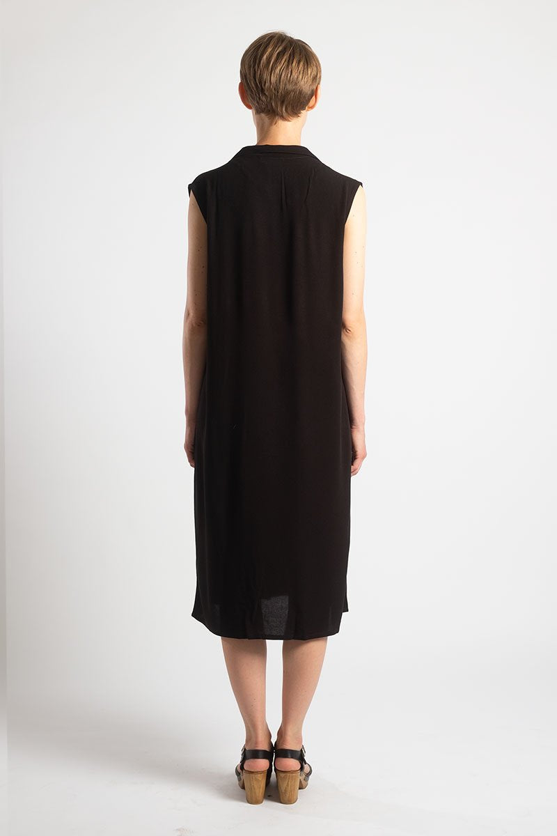 Detta är Mona! En svart klänning med knappar fram. Rak modell med veck vid axeln. Fin att användas både med och utan knytskärp. Klänningen är sydd i Estland.